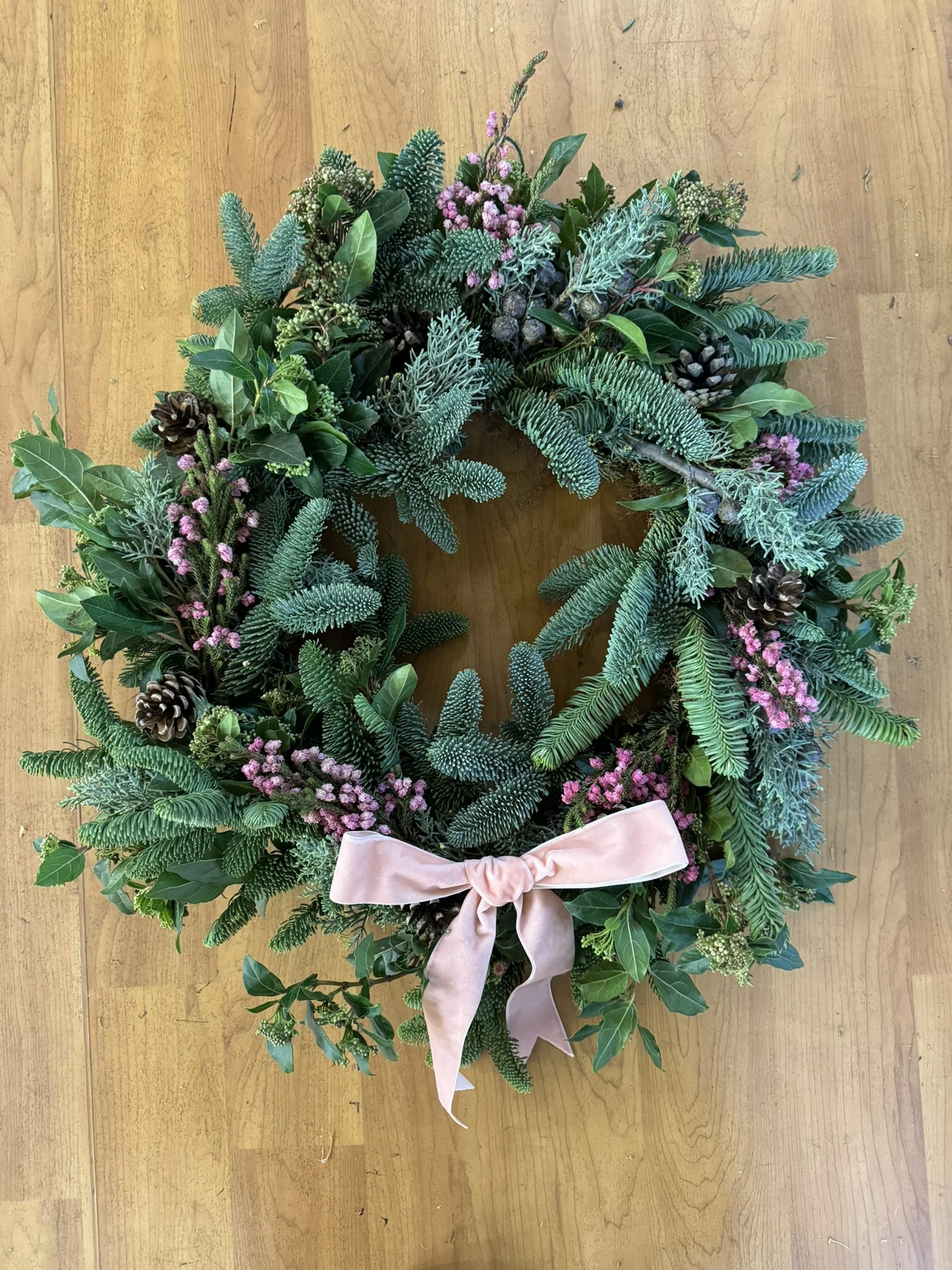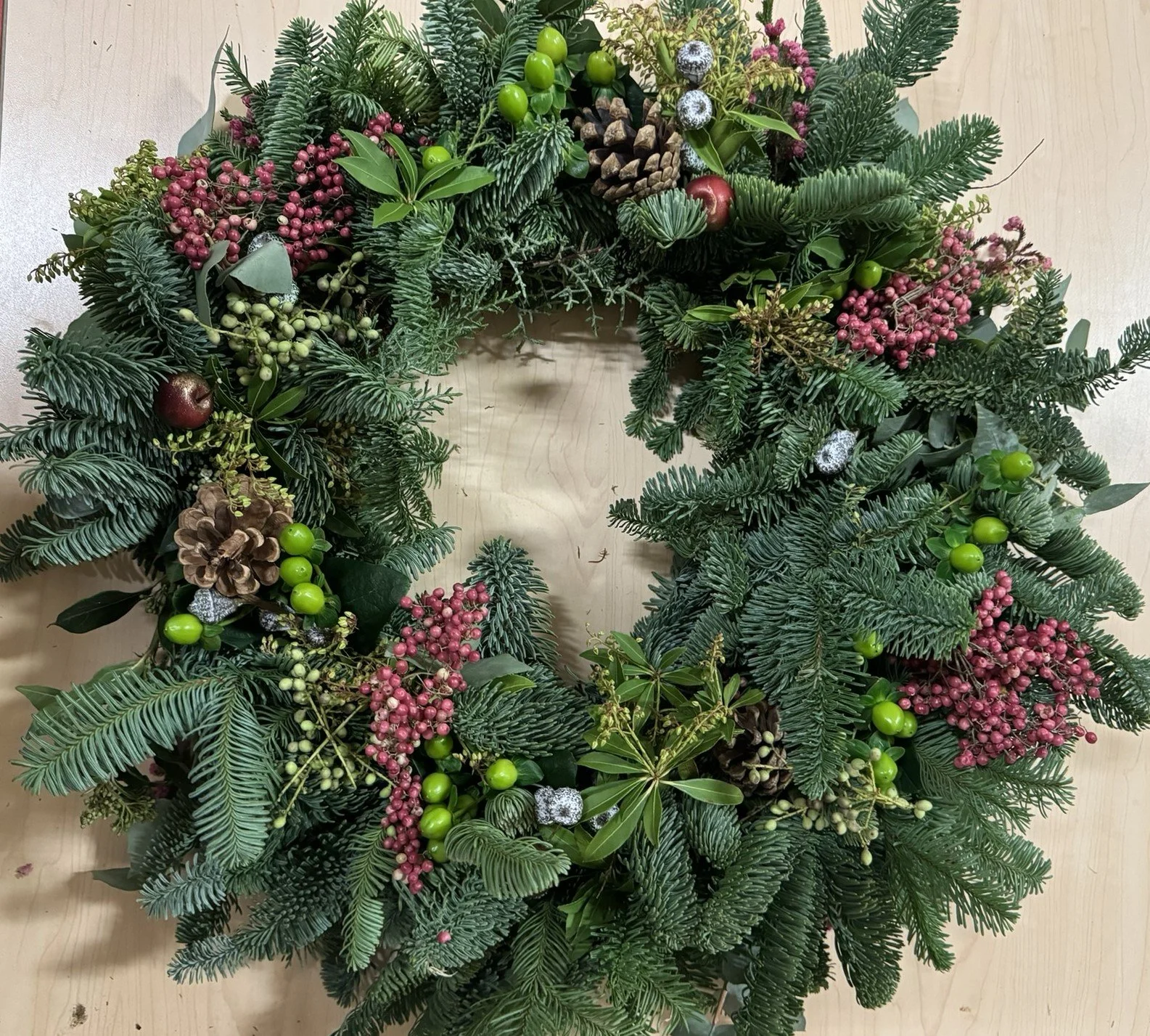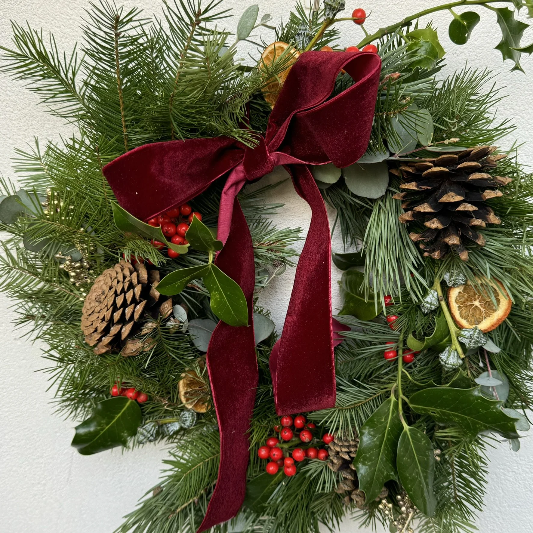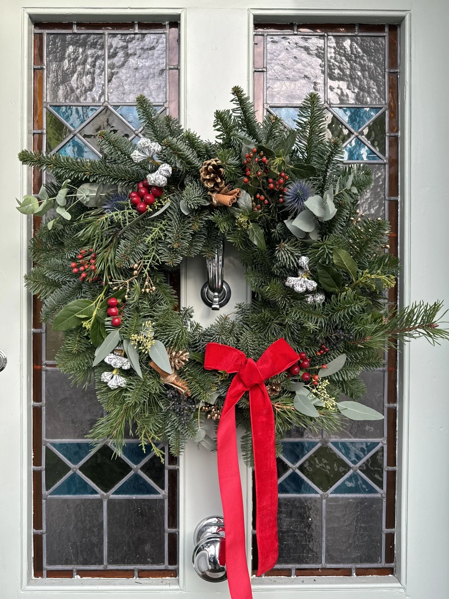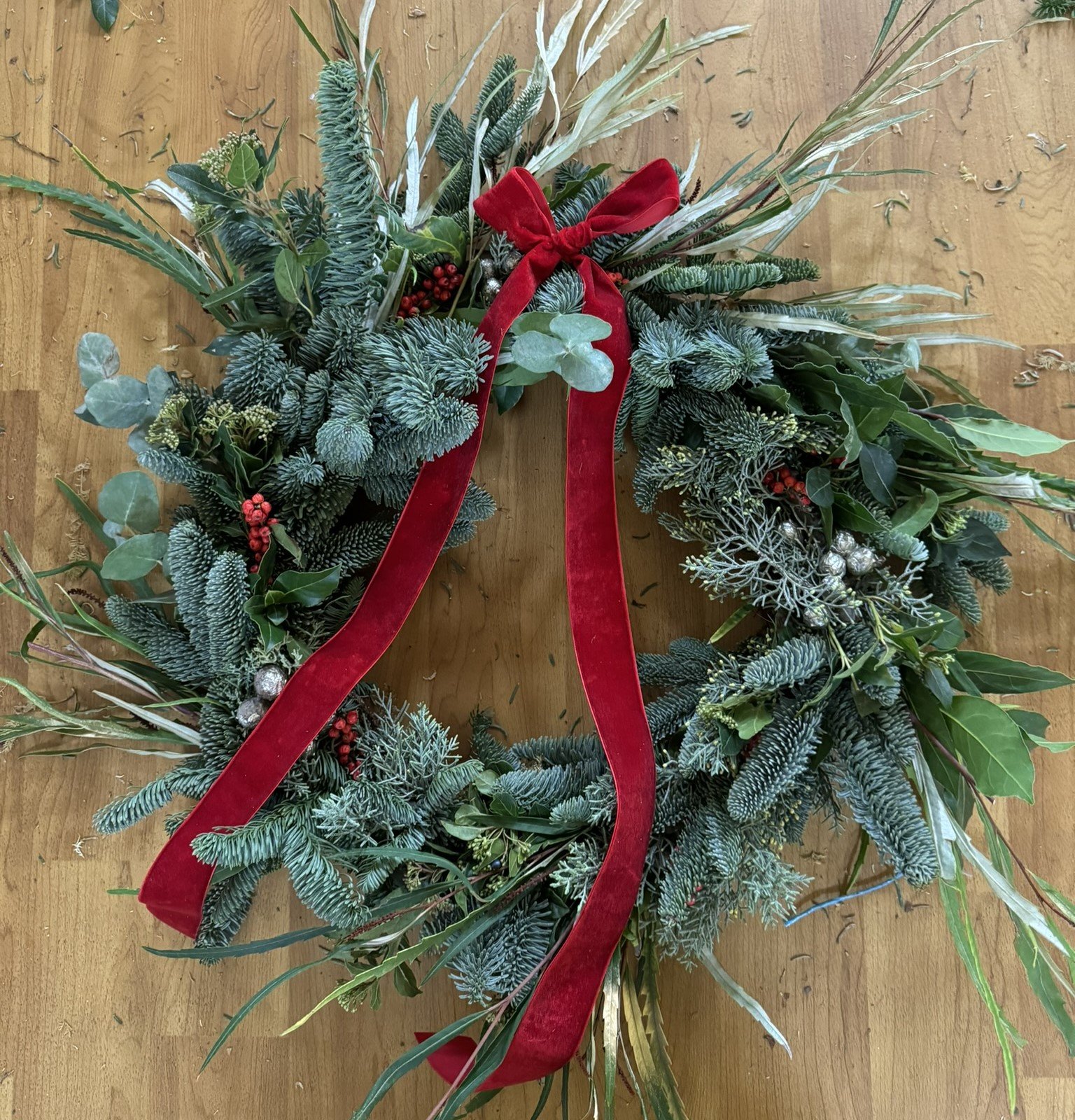 Beautiful Christmas Door Wreaths, professionally started by us and creatively finished by you.